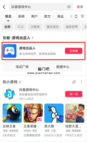 1.进入游戏出品人页面:在DY搜索【游戏中心】,进入【游戏出品人】页面。