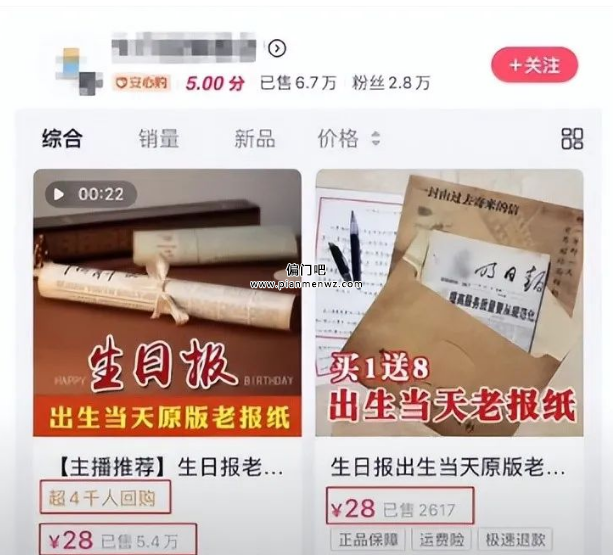 变现方式一:短视频带货,抖音有主播推荐旧报纸和生日日常,你可以定制每个人生日时发生的一切。客单价28元,销量最高的店铺一个月卖出5.4W,算下来是151W。另外光是复购用户就有4000多个,可想而知这款产品的需求有多大。即使除去买报纸的成本,净利润至少也有100W以上。