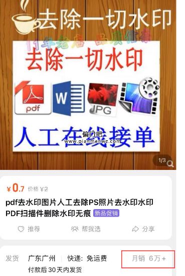 今天海哥分享个月入3W+不起眼的偏门小项目,我国人口众多,任何你所熟悉的东西都存在信息差;任何你所看不起眼的东西,别人却在悄悄用这些信息差挣钱。而这种案例每天都在我们身边上演,只是我们没有去认真细致的觉察。昨天在某宝上看到一个案例就比较触动,这个店铺也就是给别人提供去水印的服务,月销直接达到6W单,虽然客单价仅仅是7毛,但是销量乘以单价,一个月就是4W多。